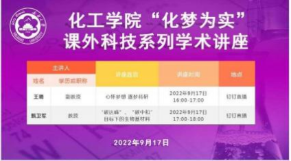 为形成“思政育人、双创育人、科研育人”的长效机制,激发学生科研热情,加大本科生参与学术科技创新力度,教育引导学生注重从专业角度出发,养成早进课题、早进实验室、早进团队的工作学习理念,bwin中国官网于2022年9月17日16点通过钉钉直播,开展“化梦为实”课外科技系列学术讲座第二季。